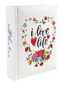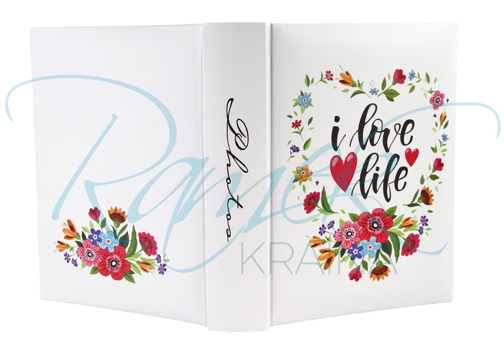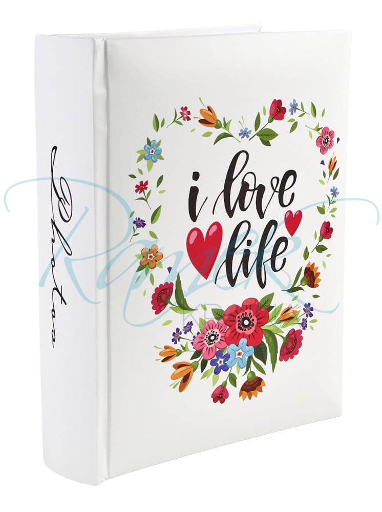 Uroczy album na 200 zdjęć 10x15 cm z napisem „I love life”. Dwa zdjęcia na stronie i miejsce na opis. Jasna, kwiatowa okładka wprowadza pozytywny nastrój.