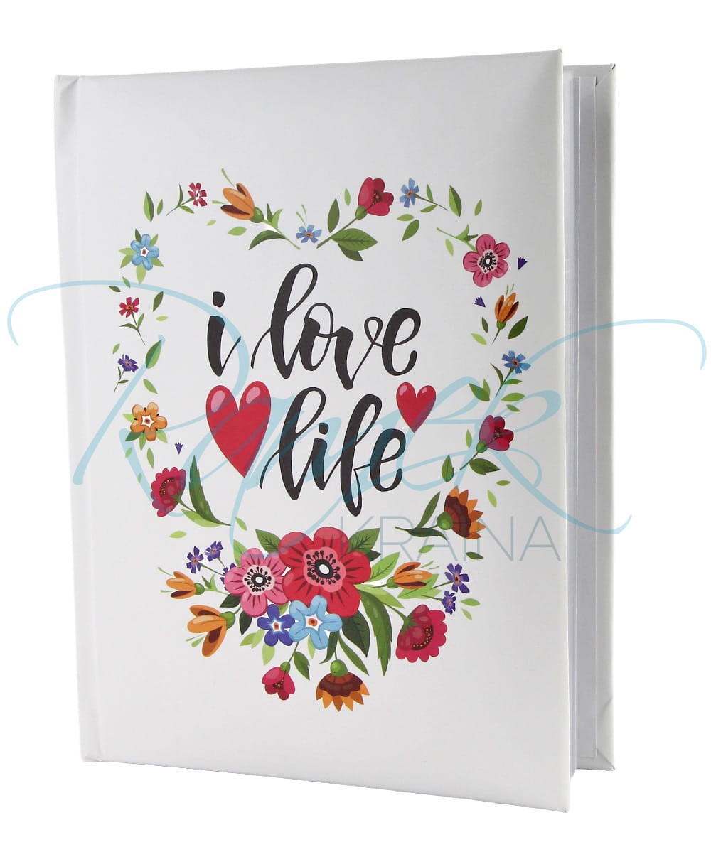 Okładka w jasnym kolorze, ozdobiona kolorowymi kwiatami i pozytywnym napisem „I love life”, emanuje ciepłem i optymizmem. To idealny wybór dla osób, które lubią otaczać się radosnymi detalami i cenią pamiątki w pięknej oprawie.