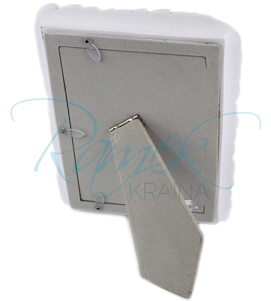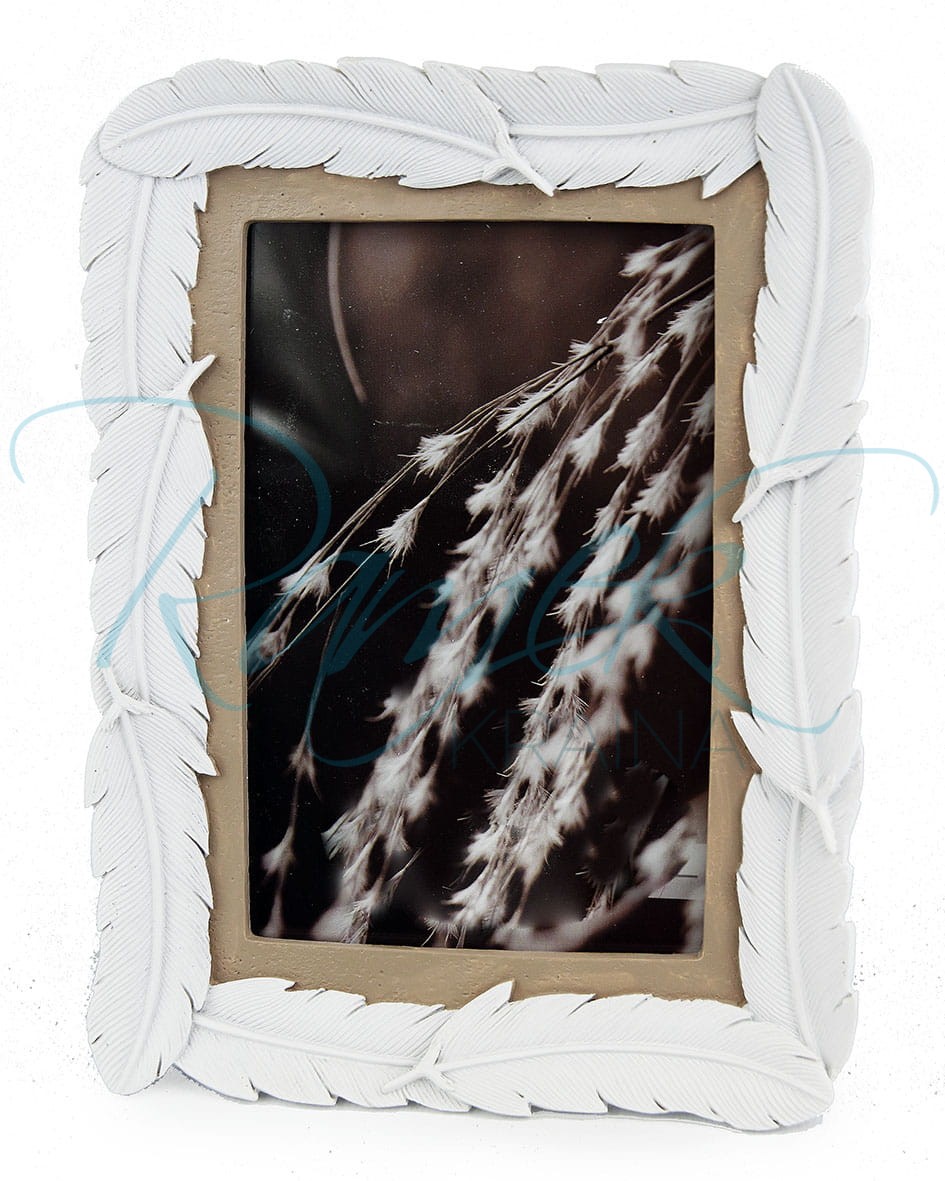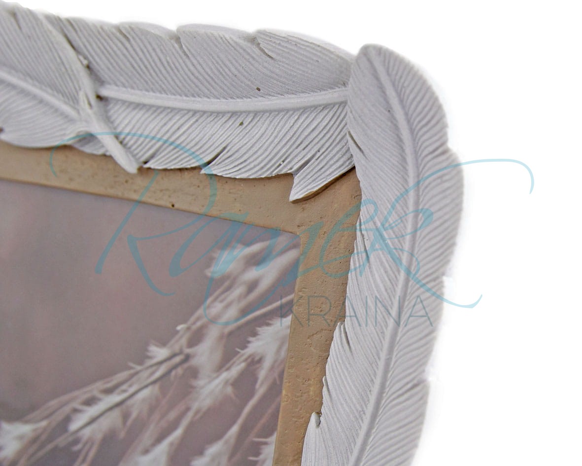 Biała, ceramiczna ramka, w której profil jest otoczony piórkami. Piórka umieszczone są na beżowej ramce. Ramkę można stawiać w pionie lub poziomie. Tył wykończony jest welurem.