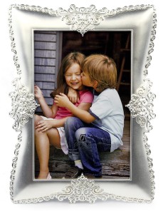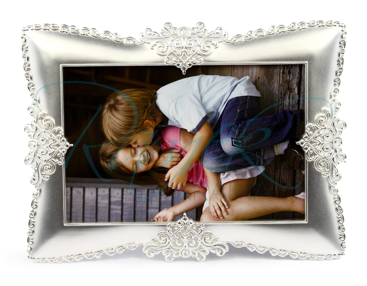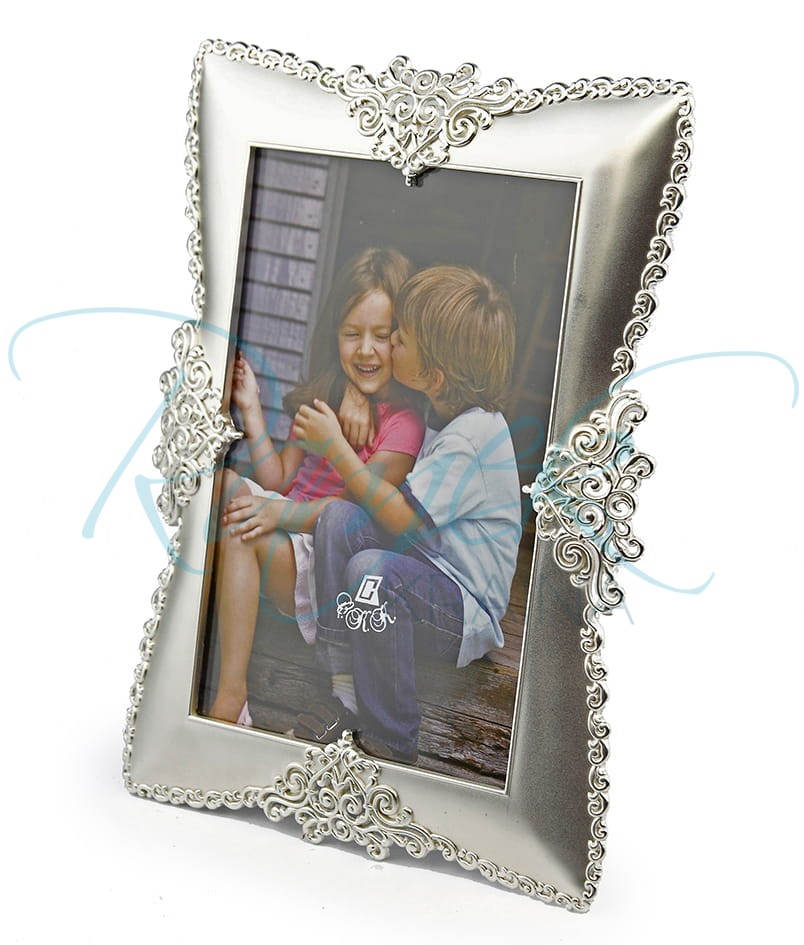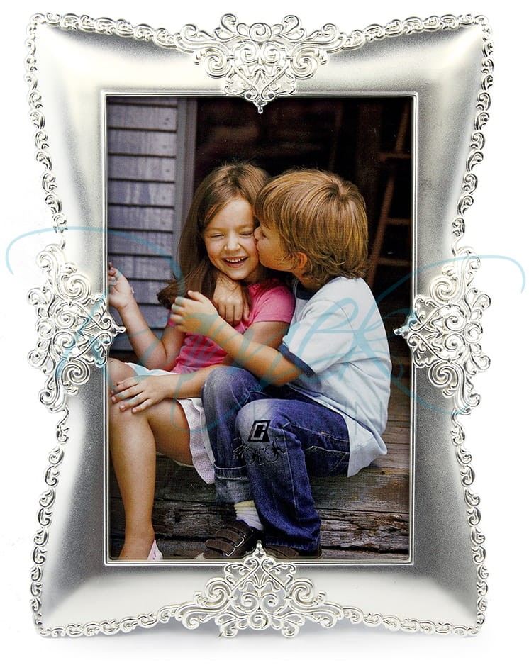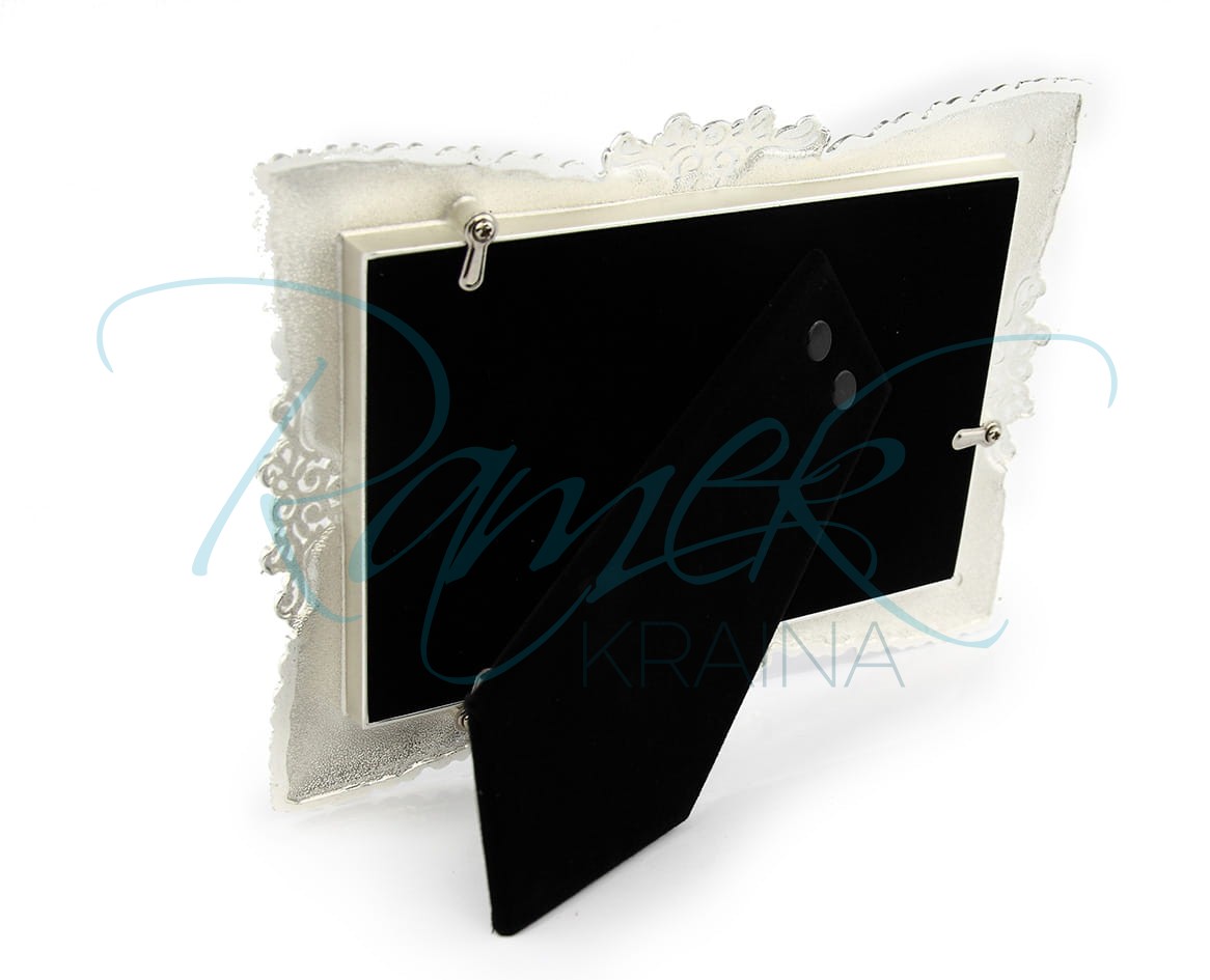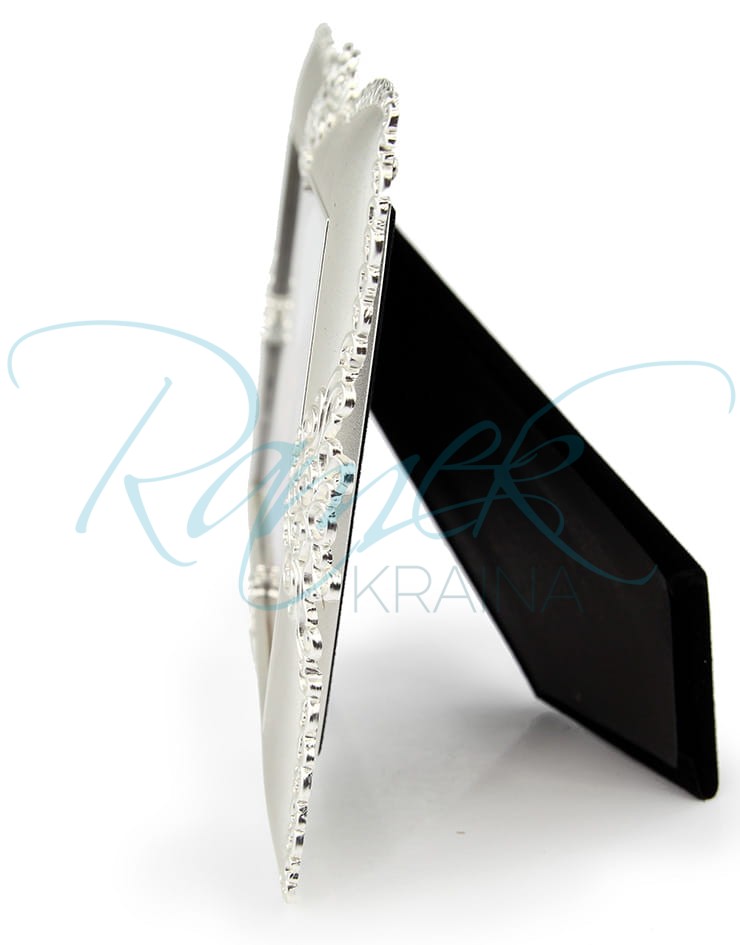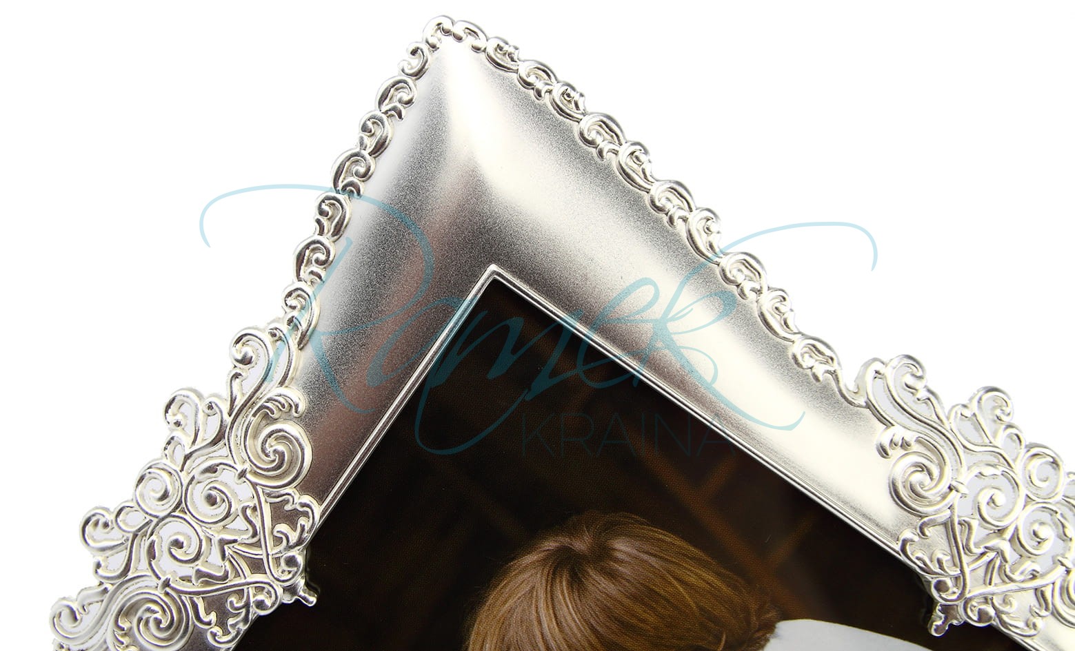 Piękna, elegancka ramka wykonana z metalu. Profil ma matowe wykończenie. Na rancie znajduje się delikatne zdobienie, które po czterech stronach łączy się z ozdobnym ornamentem. Całość prezentuje się bardzo elegancko. Tył ramki wykonany jest z weluru.