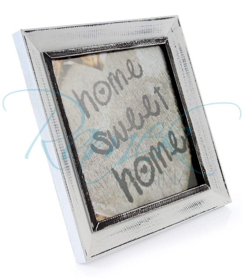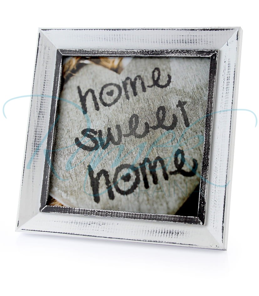 Prosta, ale ciekawa ramka do zdjęcia kwadratowego. Można w nią włożyć grafikę lub zdjęcie w rozmiarze 20x20cm. Ramka wykonana jest z drewna, pomalowana jest na biało a na profilu są szare przetarcia. Po środku znajduje się ciemniejsza listewka.