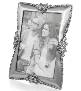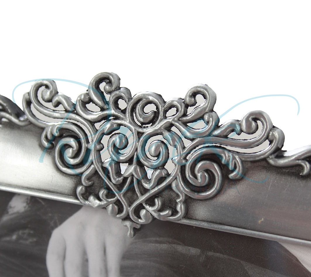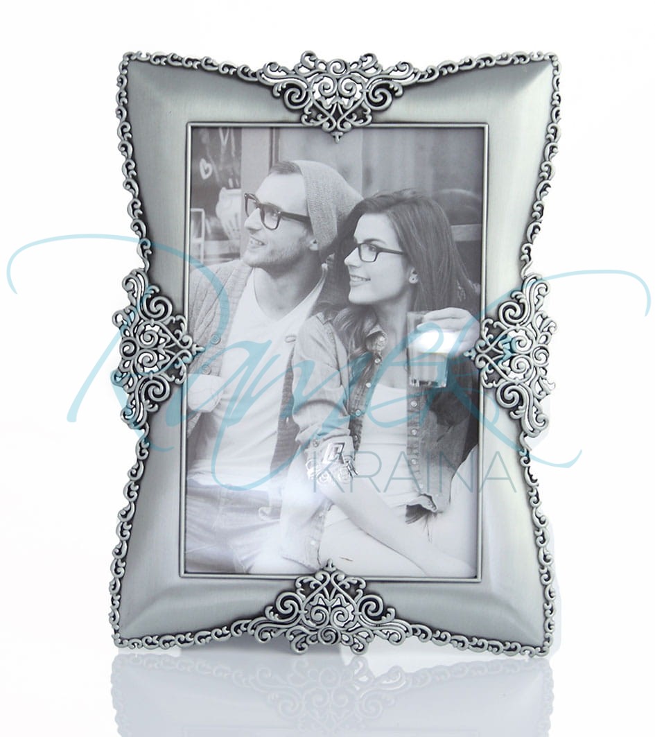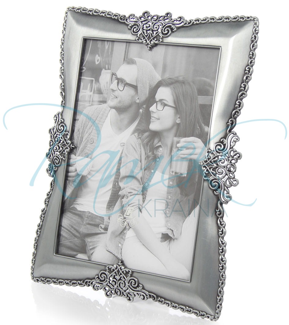 Piękna, elegancka ramka wykonana z metalu. Profil ma matowe wykończenie. Na rancie znajduje się delikatne zdobienie, które po czterech stronach łączy się z ozdobnym ornamentem. Całość prezentuje się bardzo elegancko. Tył ramki wykonany jest z weluru.